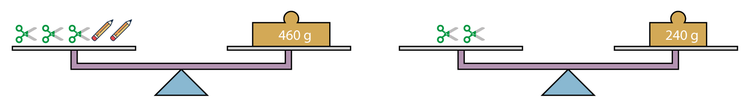 On dispose de paires de ciseaux toutes identiques et de crayons tous identiques. On dispose des résultats suivants issus de deux pesées :