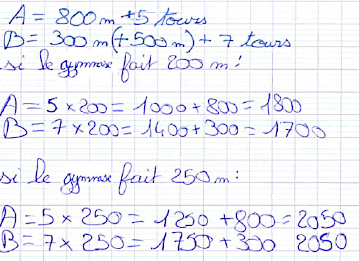 Alice part de chez elle, fait 800 mètres pour arriver au stade, fait 5 tours du gymnase puis rentre chez elle.