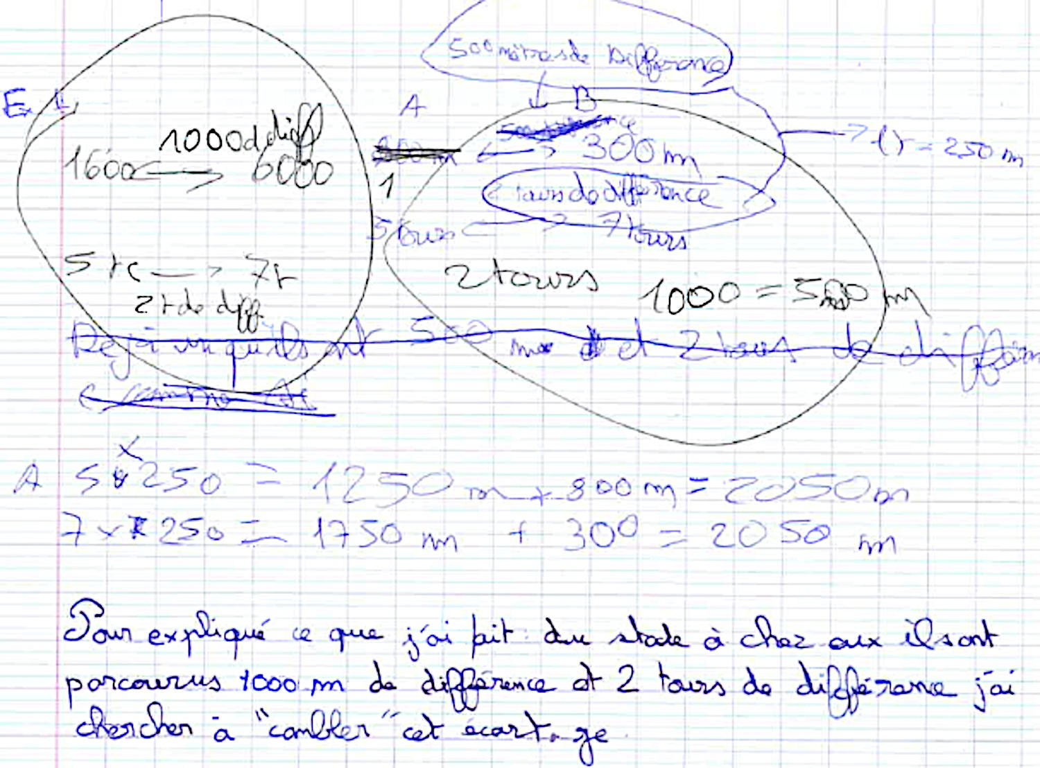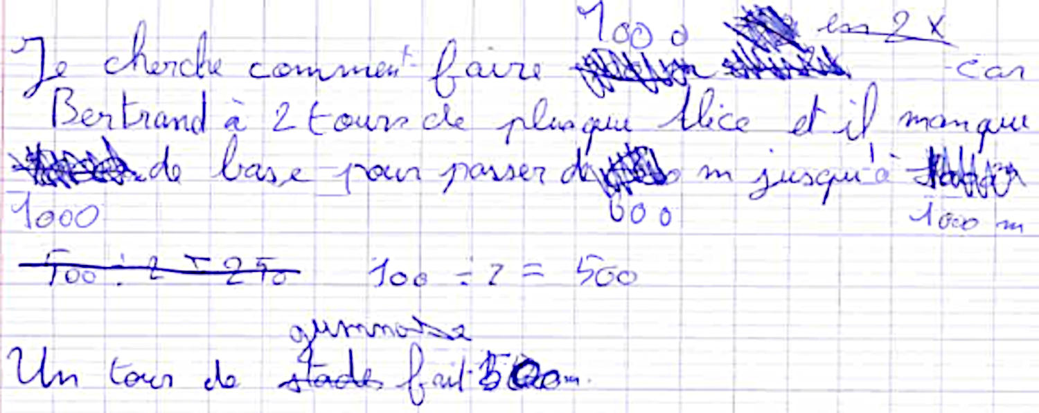 Je cherche comment faire 1 000 car Bertrand a 2 tours de plus qu'Alice et il manque 1 000 de base pour passer de 600 m jusqu'à 1 600 m.