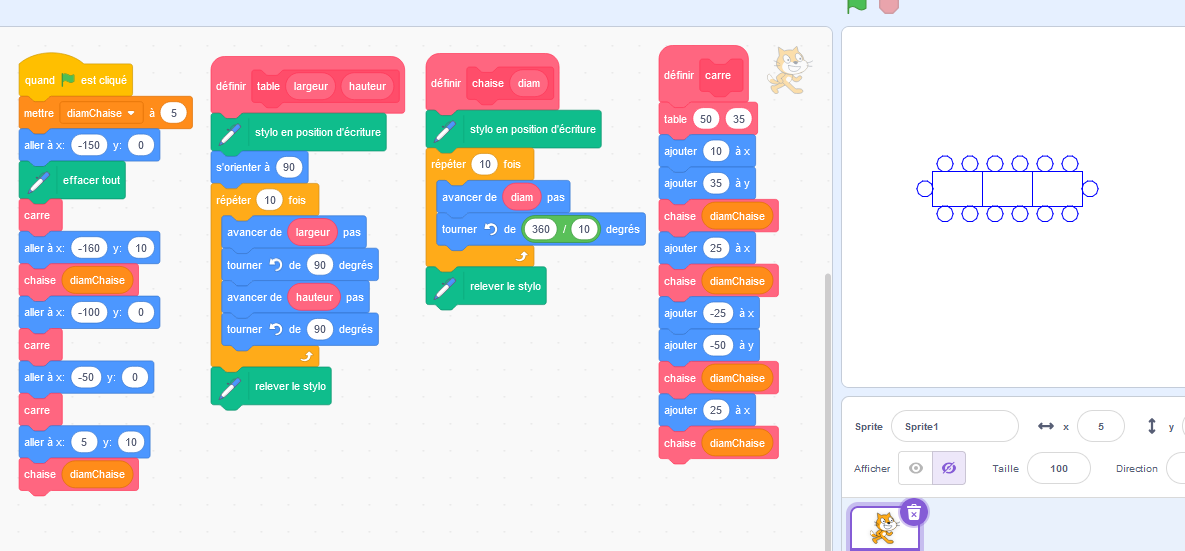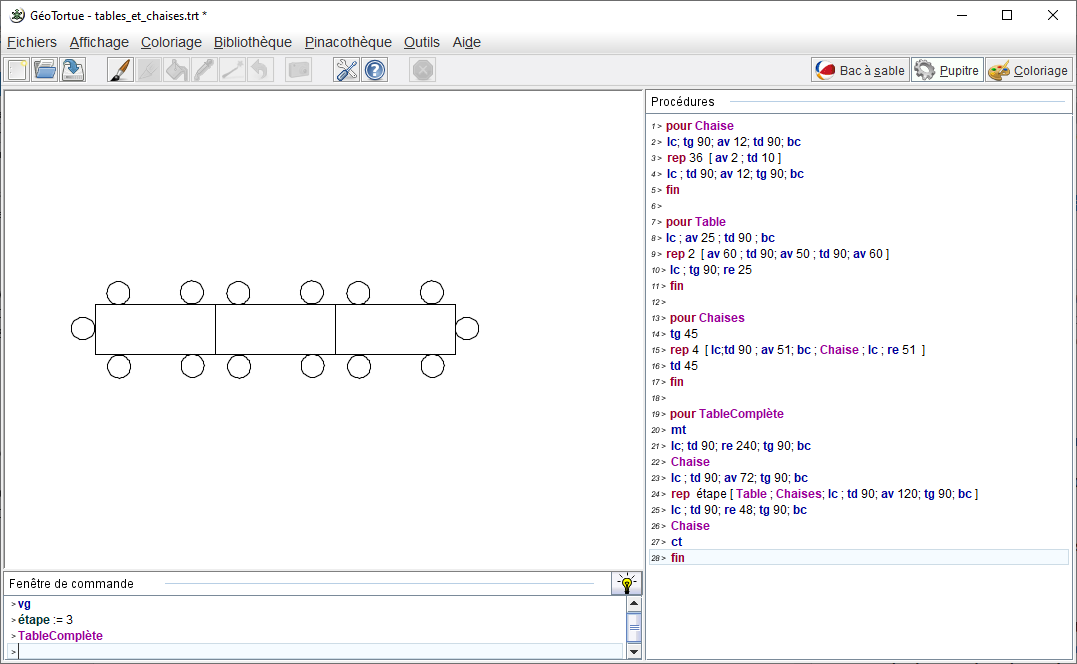 Pour l'étape 2, je prends l'étape 1, j'ajoute une table de 6 et je retire les deux chaises qui empêchent de "coller" les tables.